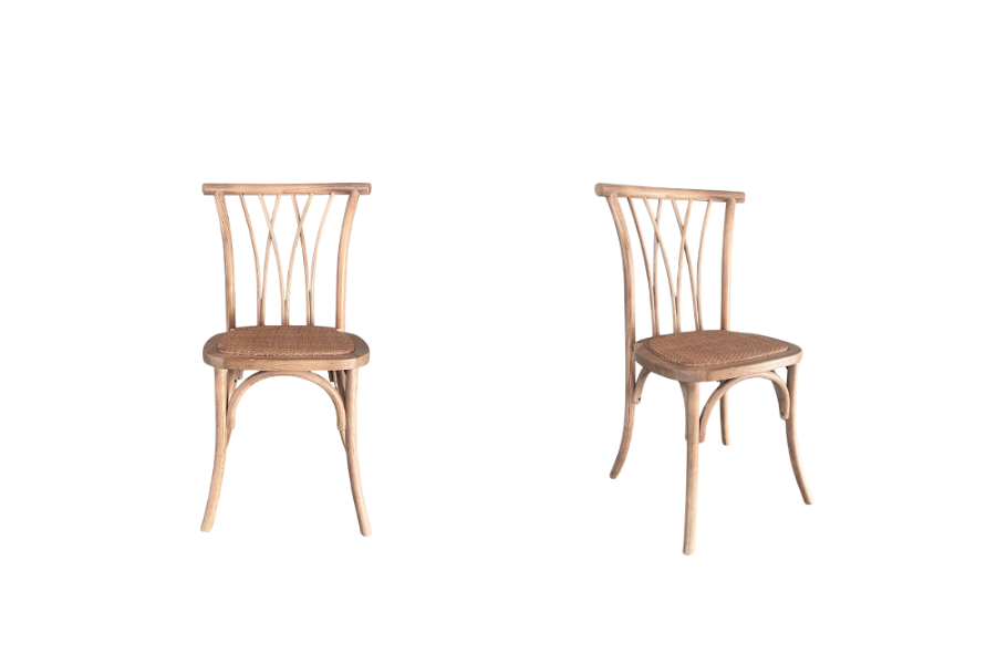 The Willow Chair offers an effortless blend of warmth and craftsmanship. Made from raw, natural wood with a gently curved silhouette and woven rattan seat, it feels both organic and timeless—perfect for modern event design.